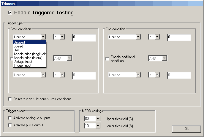 When performing triggered brake tests the MFDD calculations can be performed during the test. When doing this kind of test the relevant MFDD values for the upper and lower testing threshold must be set here.