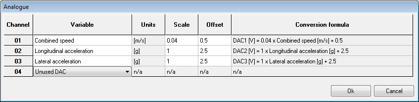 For each input, the drop down selector box in the ‘variable’ column can be used to select the output. This can either be one of the internal variables which will be used as a DAC output, or it can be used as an ADC input. When used as an analogue input the data will be transmitted on the serial port and CAN ports as analogue channels 1-4.
