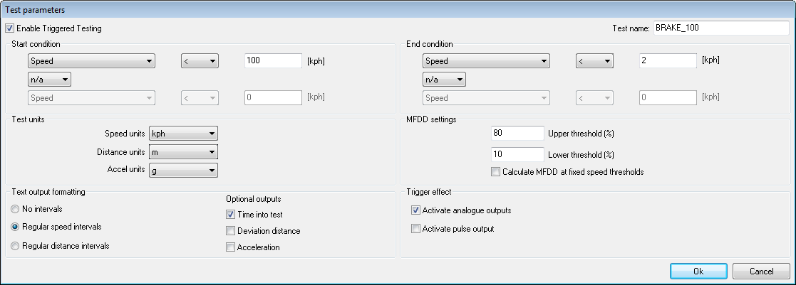 The configuration for MFDD (mean fully-developed deceleration) is specified here. MFDD thresholds can be specified either as a percentage of the start speed, or as fixed speeds using the currently configured speed units if the checkbox "Calculate MFDD at fixed speed thresholds" is checked. In either case, the MFDD will be flagged as invalid in the output if the configured MFDD thresholds cannot be physically passed by the configured test.