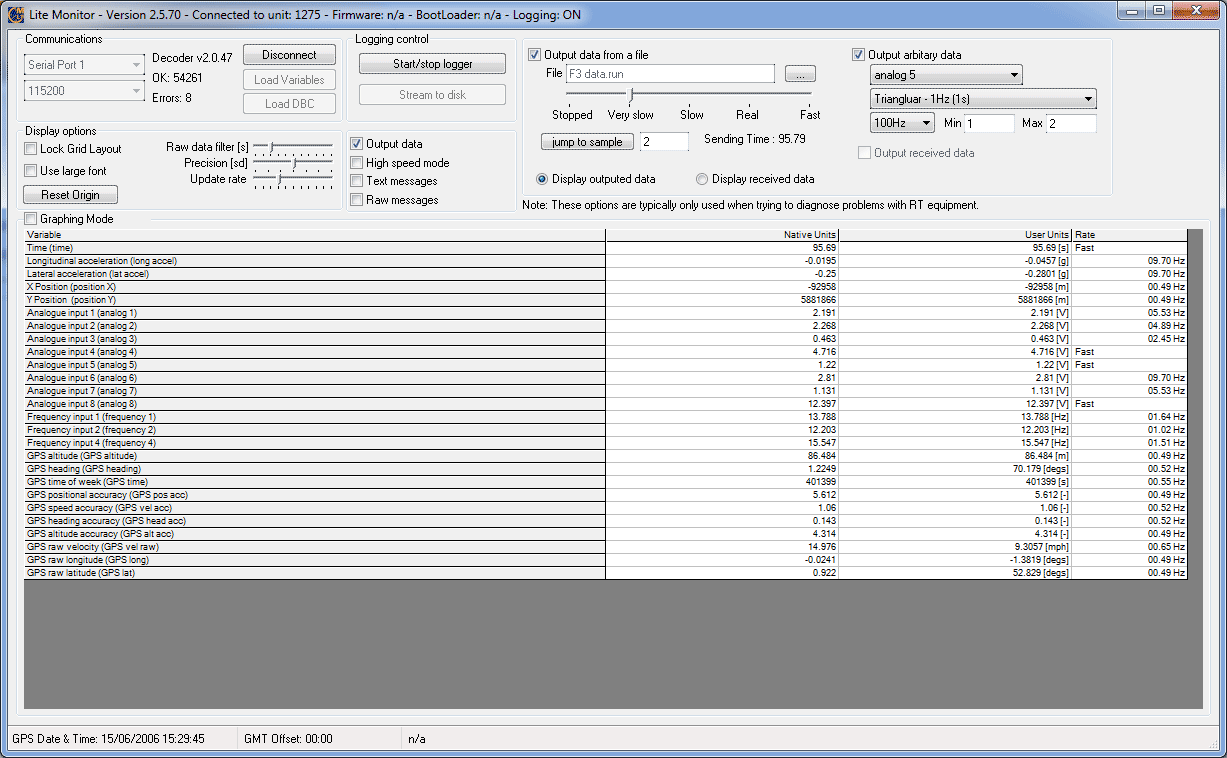 For example if you are setting up some new sensors it is normally quicker to connect the sensors up in the car, connect the data logger to the lite monitor to verify that everything is working as expected.