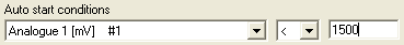 You can choose where the trigger comes from, i.e. if you have an external sensor attached to Analogue Input 1, and you wish for it to trigger when the voltage from the the sensor goes under 1.5 Volts, then the options you would choose from the Auto start conditions section would be:
