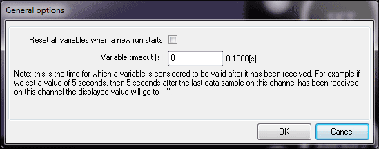 By ticking the option to Reset all variable when a new run starts, when logging is started on an attached data logger, the values of all variables will be cleared, this stops old data from a previous run from being displayed. The same effect can be achieved a fixed time after the last valid value is received by setting the variable timeout time.