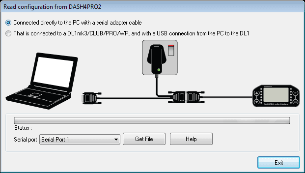 To transfer the configuration from the DASH4PRO unit and load it to the software, you must first connect the device to computer through the COM port. Make sure to switch off the device whilst connecting.