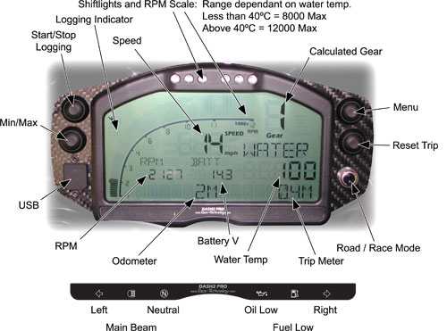 - RPM scale and shiftlights - scale 0-8000 when water <40oC/0-12000 when water >40oC