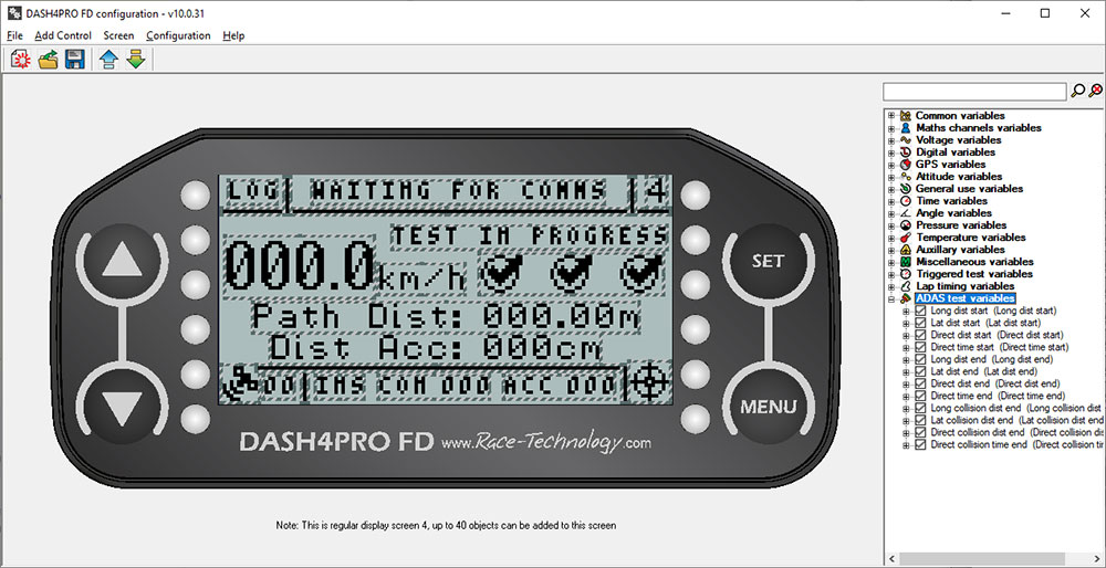 The DASH4PRO FD is supplied with comprehensive configuration software. The software allows free placement of variables, text and graphs anywhere on 1 of 10 standard screens or pages.