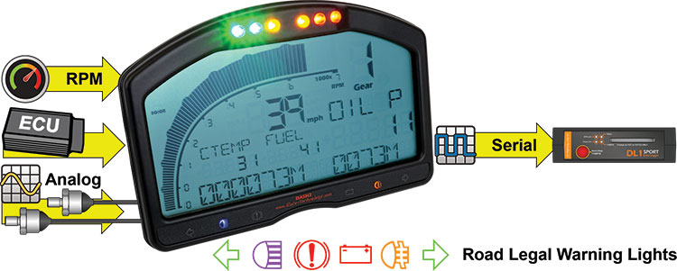 When used in standalone mode, the DASH2 can connect to four sensor inputs, for example water temperature, oil pressure, fuel level and boost pressure. These sensors can be from Race Technology, or almost any 3rd party sensor. It also has inputs for RPM, speed, non-resettable odometer and warning lights for full road legal operation.