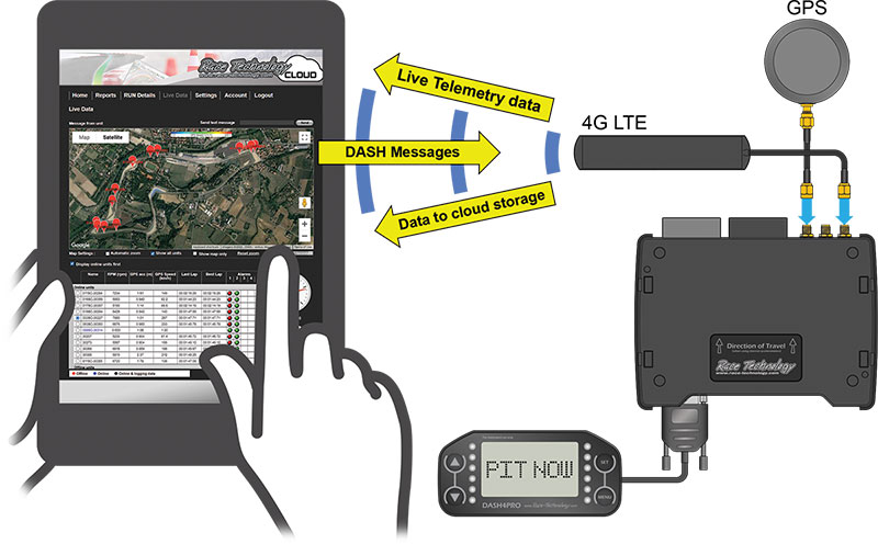 RT LIVE Motorsport is an online data logger, with data logged to the internet via a 4GLTE mobile data connection. Data files can be accessed over the internet and live telemetry data, including lap times, can be viewed live using a web browser and/or our PC software.