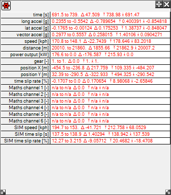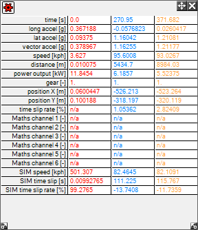 The way the data is represented changes on how it's selected. If you have a singular point selected on the Track Map or the XY Graph, then the data displayed will be specific to that point on the graph/map. If you have more than one trace displayed on the track map or graph, then the Values Table will display all the variable data relevant to all the points selected. the data will be colour co-ordinated with the points you have selected. For example, if you had selected three laps on the track map and clicked to select one point on all three maps, the values table would look like this: