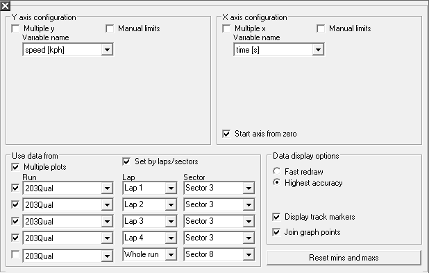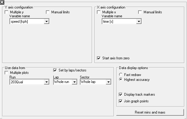 If you have more than one run loaded, you will be able to select it from the "Use data from" section. To choose the variable for the Y-Axis, select the variable you want to compare from the Variable Name list under the "Y axis configuration" section. To choose the variable from the X-Axis, choose the variable you wish to compare against from the Variable menu under "X axis configuration" section. To choose which part of the run you look at, make sure you have set up lap and track markers, then select which section you wish to look at from the drop down menus. Alternatively, if you've not got the lap and track markers set up, you can uncheck the "Set by laps/sectors" box and set which section of the entire run you look at by entering times into the boxes: