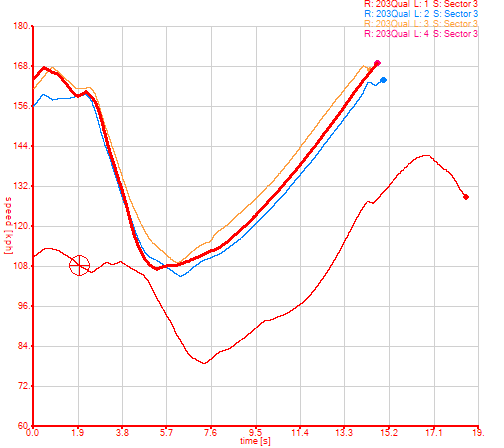 - Highlighted Data - This appears as a bold line for all the data selected elsewhere, i.e. a sector in the Lap And Sector Times table.