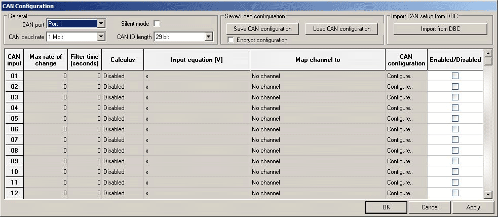 CAN configuration files can be loaded and saved independently of the main DASH2 PRO configuration. They can also be encrypted for distribution where the actual configuration of the CAN messages needs to be kept confidential.