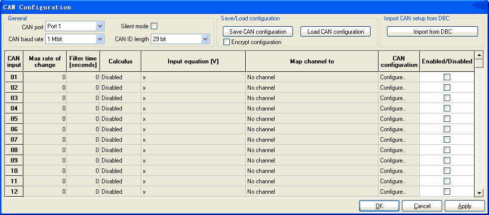 This is done from the main screen on the CAN configuration section. Basic settings for the CAN bus such as the identifier length (11 or 29 bit) and bit rate are also set here.