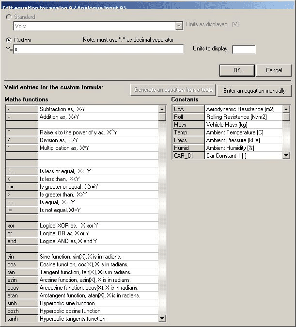 The equation can be edit to scale or apply other mathematical functions to the incoming data. The required output of the equation in terms of units is shown as 'Units as displayed', in this case Volts.