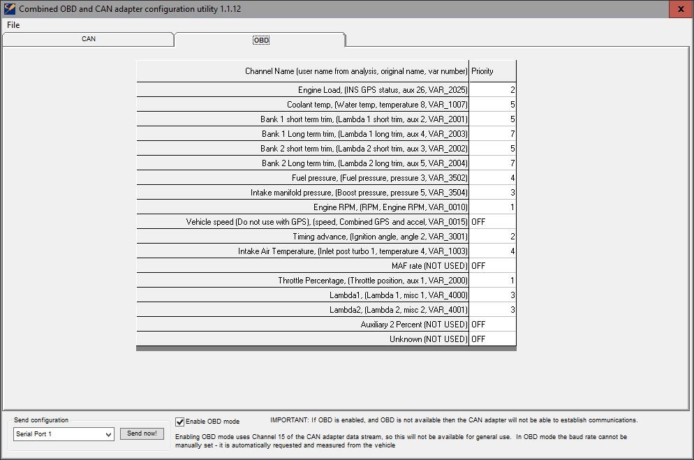The OBDII mode will only work with vehicles equipped with CAN based OBIDII interface, the interface needs to be ordered from Race Technology as an OBDII version. When enabled the OBDII tab can be selected from where the priorities of the different messages can be set: