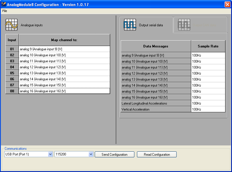 When using the ANALOG8 with Mk1/Mk2/Sport versions of the DL1 Logger where the analogue inputs are set as a fixed channel, the ANALOG8 must be configured to ensure that the same channel names are not used.