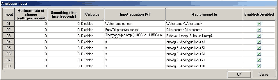 As configured by default, the input will be read as a voltage and will be stored on the analogue input channel as shown in the table above. For various sensors the scaling can be easily set to convert the voltage reading in to a temperature reading which can easily be displayed in the required units. For example, if there is a water temperature sensor attached to input 1, an oil pressure sensor in analogue 2, and an exhaust thermocouple in analogue three it could be set up like this: