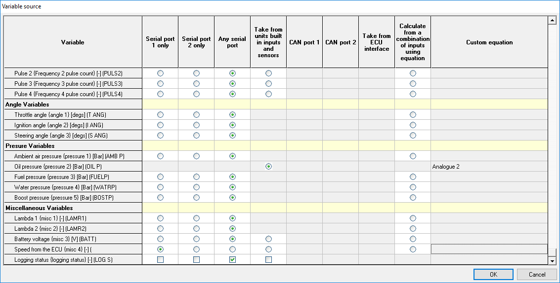 From the configuration software click on Variable Source. Scroll down to the bottom of the list and tick the relevant button for the serial port to which the ECU interface is attached.