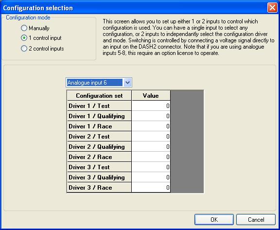 Switching between the different user modes can be done from the DASH2 PRO directly, more details of which are here, alternatively it is possible to set up an analogue input on the unit to act as a switch between drivers and modes. To do this select Configuration Set / Configuration Selection.