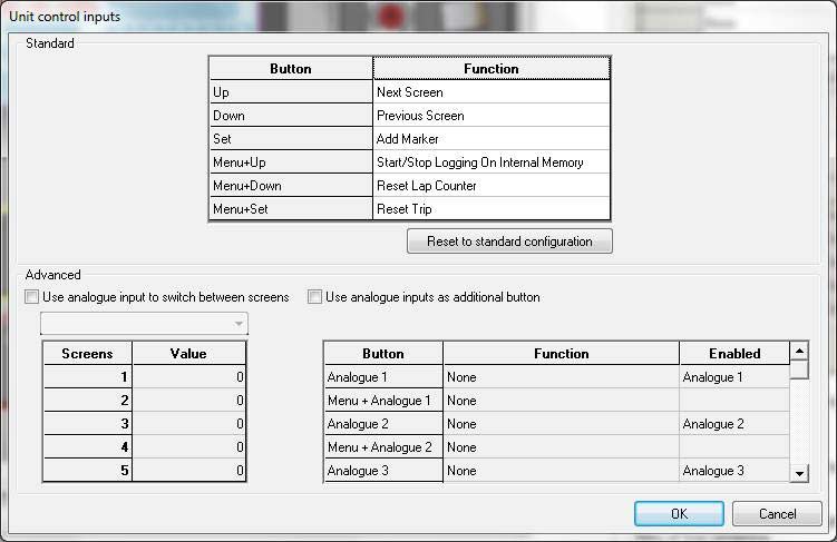 The Advanced unit control inputs enable Analogue inputs which are not currently configured for data logging to be used as additional soft buttons, or to switch between screens. Note that any analogue inputs which are currently configured for logging will not appear in this list, if all analogue inputs are configured for logging then no settings can be made here. Analogue inputs are configured here.