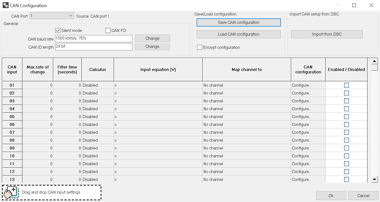 This is done from the main screen on the CAN configuration section. Basic settings for the CAN bus such as the identifier length (11 or 29 bit) and bit rate are also set here.