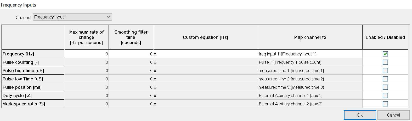 The different inputs can have filtering applied or custom equations in just the same way as the analogue inputs can. The channels to which the inputs can be mapped are as follows: