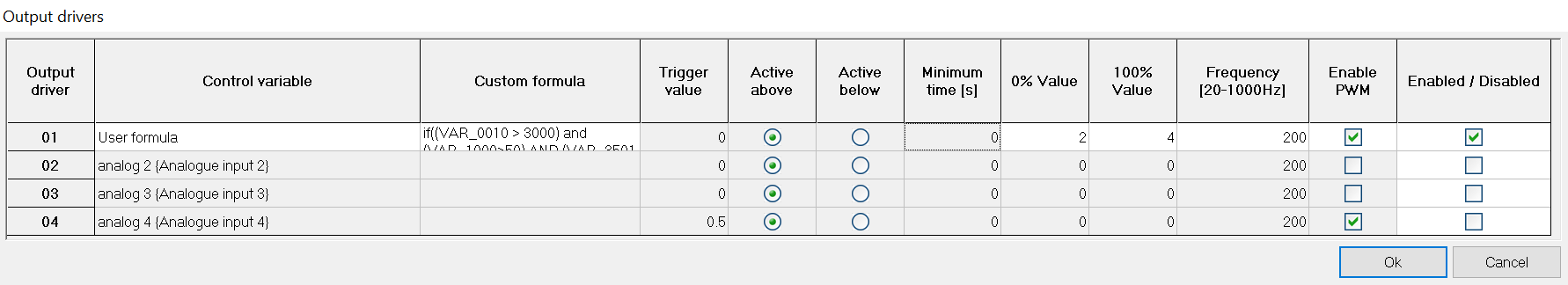 For the On/Off control mode, a control variable must be selected, this can either be one of the built in channels, or if ‘user variable’ is selected from the control variable list an equation can be used in the custom formula box. The custom formula enables very powerful control of the outputs. For example, by using the custom equation: if((VAR_0010 > 3000 and VAR_1008 > 50 and VAR_3501 < 2),1,0), will mean that if: