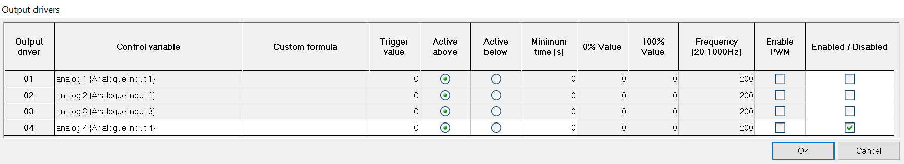 The output pins are configured from the Output Drivers icon on the DL1 FD/DL2 FD configuration software.