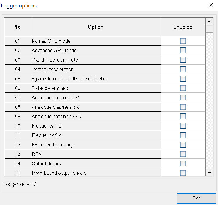 To find this, open the DL1 FD configuration software, connect to the DL1 FD through the USB port in the usual way to read the configuration data, then go to Options / Logger options. The list of available and enabled options will be displayed: