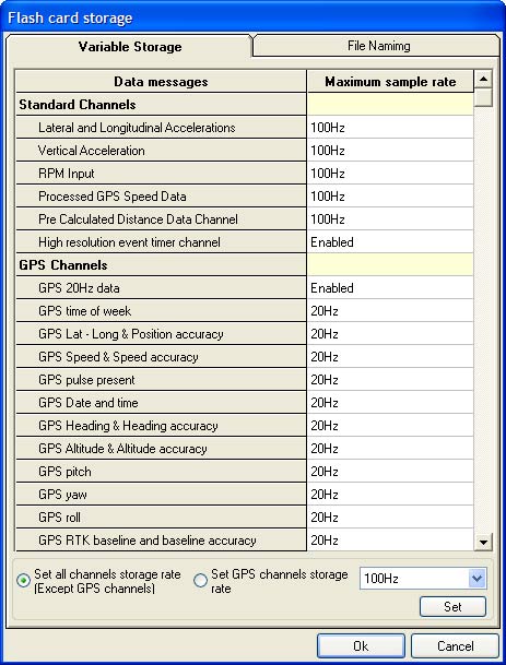 By default, all of the channels of data are set to store as fast as possible. This is 100Hz on all sensors except for GPS, and 20Hz on the GPS data. If internal GPS data is used, the actual maximum data storage rate will be 5Hz as that is the internal update rate.