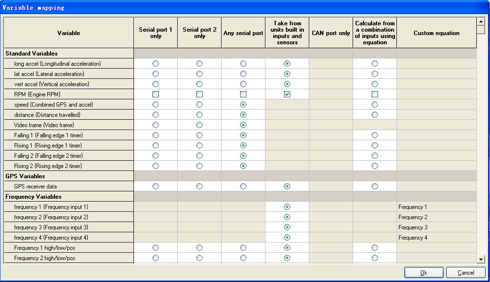 Some options on this screen are taken care of automatically. If any of the built in analogue inputs are mapped to a particular channel, then this is fixed in the variable mapping. The source of the data is shown on the screen. In the screenshot above it can be seen that analog channels 1-6 are coming from the external analogue input channels 1-6. As such, there is no option to change this.
