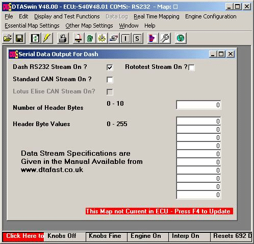 To set up the ECU, open the DTASwin software and connect to the ECU. In the Other Map Settings > Data Stream options, set up the unit as shown in the below image. Send the new map settings to the ECU, this can be done by pressing F4.