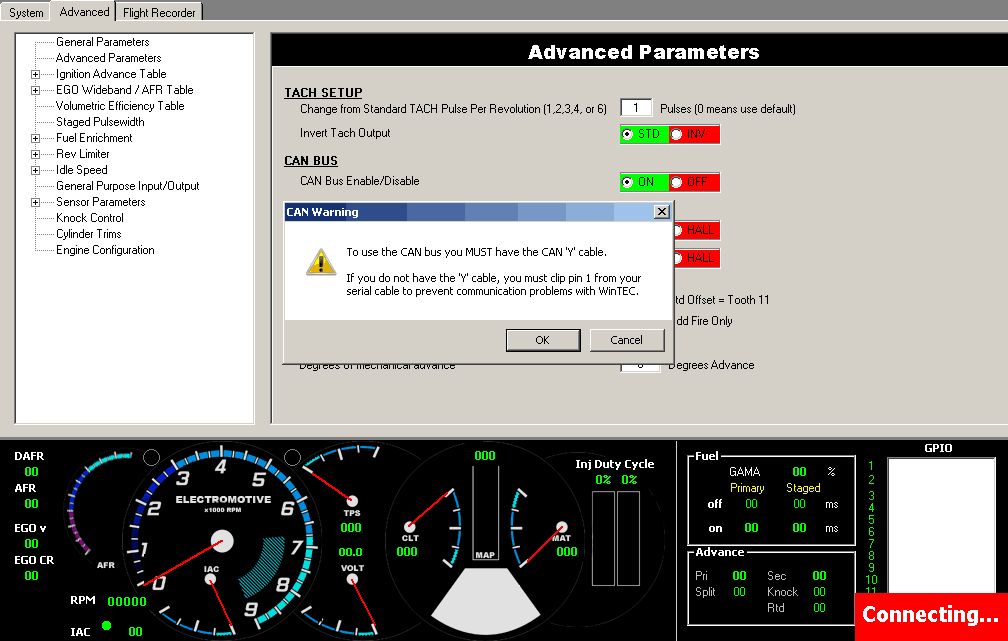 As the CAN Warning in the above image states, the CAN 'Y' Cable must be used. This cable is supplied by ECU manufacturer. If you do not have this cable, please purchase it from Electromotive before continuing.