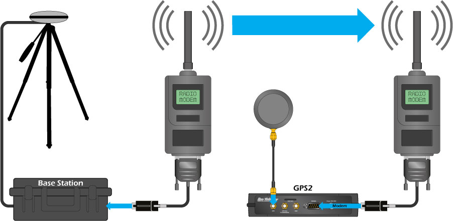 - Attach radio modem transmitter to a base station, configured to use the same radio frequency as the radio modem receiver attached to the GPS2 RTK.