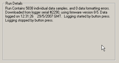 step 2: this will open up a window. At the bottom of the window, under the heading "Run Details", you will find a breakdown of the details of the run. The reason why the unit stopped logging data will be stated at the end of this breakdown. In this example, the stop logging button was pressed.