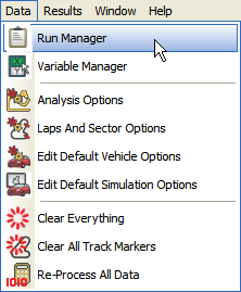 step 1: Load up the data that was logged into the analysis software, and enter the "Run Manager" feature in the data menu (this can be found in the top, left hand corner of the screen).