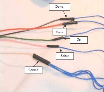 step 5: This will designate the function of the wires. The button connected to the brown wire will be "Down"; the one connected to the orange wire will be "Menu"; the one connected to the green wire will be "Up"; and the button connected to the pink wire will be "Select".