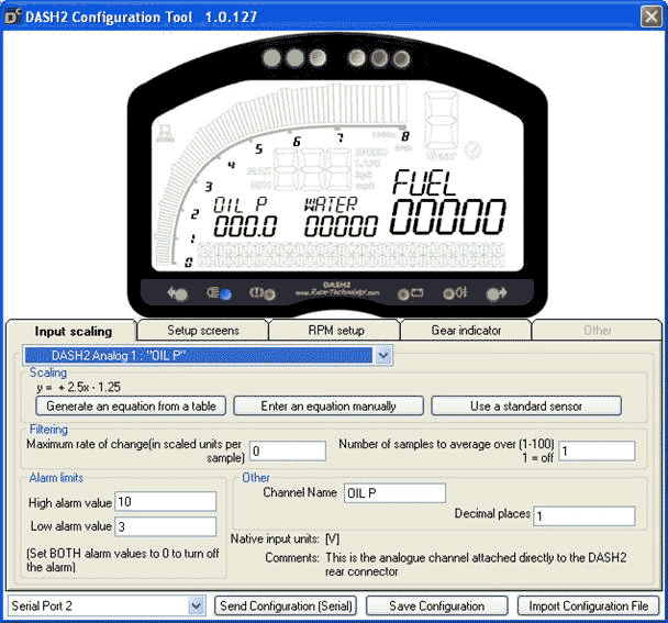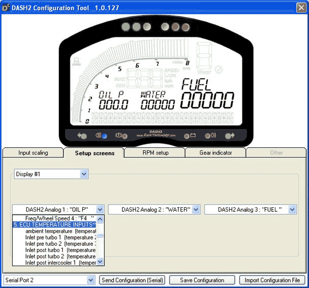 In the middle of the screen there are 4 active tabs, “Input Scaling”, “Setup Screens”, “RPM Setup” and “Gear Indicator”.
