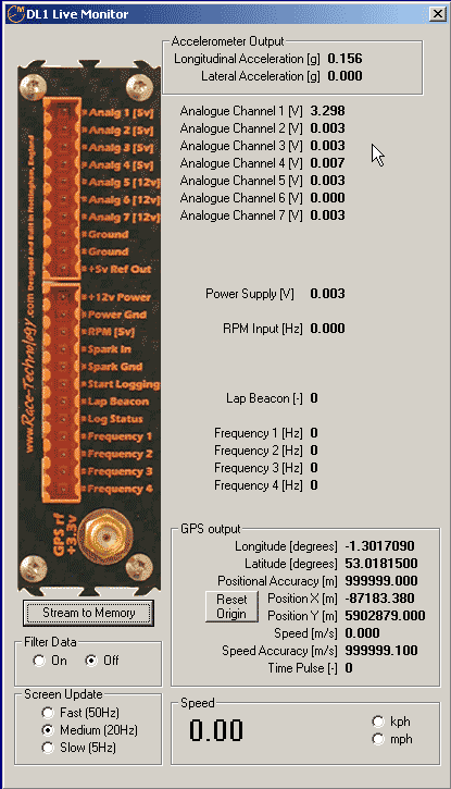 step 5: This will bring up the "DL1 live monitor". The sensor is wired to "Analogue Channel 1", and, if it is working correctly, this channel should show much higher readings than the others.