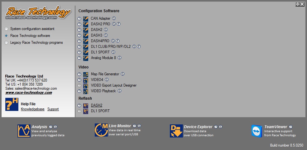 Step 2: Open the Race Technology program launcher, find the reflash section and select DASH2. (Note that the look of the menus depends on the configuration of your PC and the version of Race Technology software currently downloaded.)