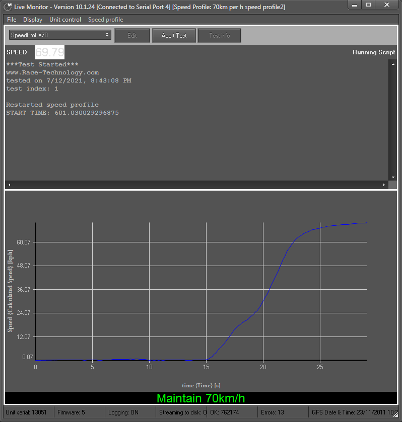 Once the file is loaded, Live monitor displays a summary of the loaded profile with the total duration of the speed profile and the maximum speed.