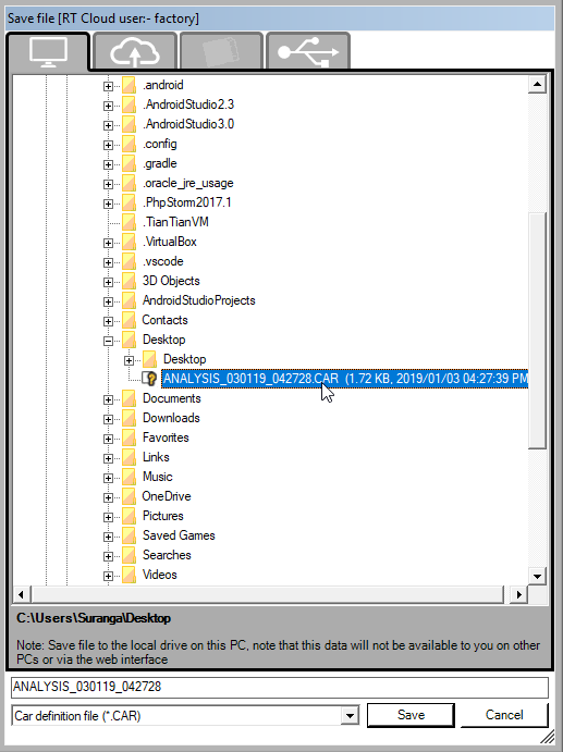 You can either save vehicle options to a new file by selecting a directory, entering a file name and clicking on "Save",