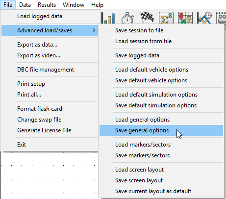 To load a previously saved General Options file (.CFG), go to File > Advanced load/saves > Load general options.