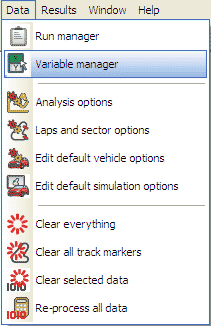 step 1: Load in your run to the analysis software and enter the "Variable Manager" option in the Data menu. You will find this in the top, left hand corner of the screen.