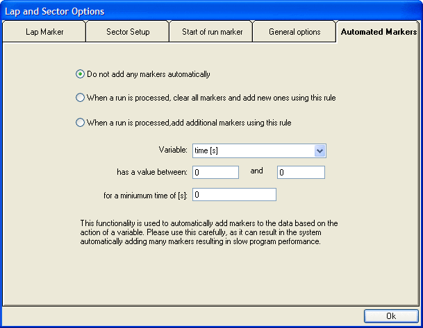 NOTE: The options on this tab allow you to automatically add markers to the data based on the action of a variable. Please use this carefully, as it can result in the system automatically adding many markers resulting in slow program performance.