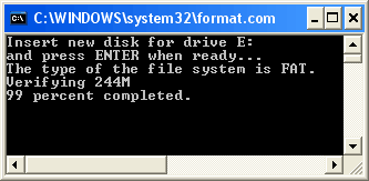 When you click yes, the software will open an MS-DOS prompt running the format.com program. This has been set to run with the correct parameters. The file system it will format to is FAT16 (on Windows XP, this is just labelled FAT). This again will ask for confirmation, press the ENTER key to continue:
