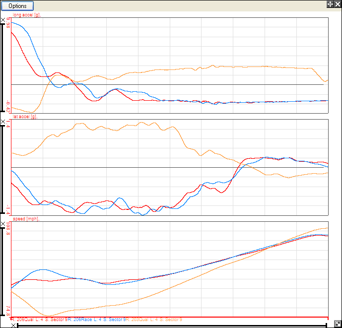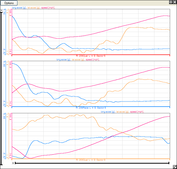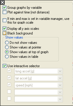 When you open up the Quick XY Graph, the default settings will show the longitudinal and lateral accelerations and speed against time. The graph will also initially be set to group by variable, meaning that the longitudinal acceleration for all the highlighted data will be shown on the same graph: