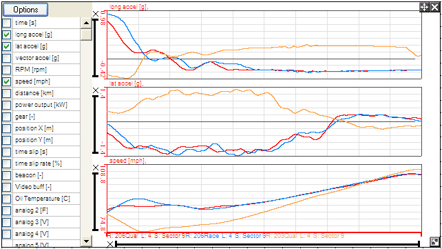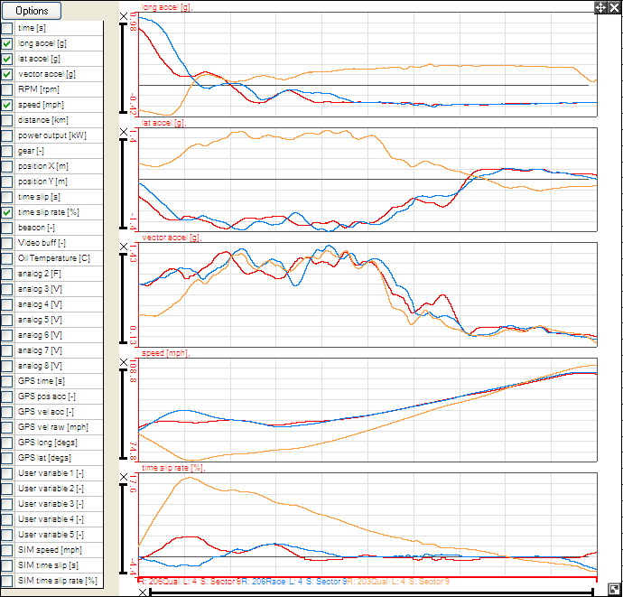 By default, the graphs are set to plot against distance. This means that you can compare the speeds of the cars on the same section of track at the same point, as apposed to the same time, this will give a more accurate comparison because the runs will take different lengths of time.