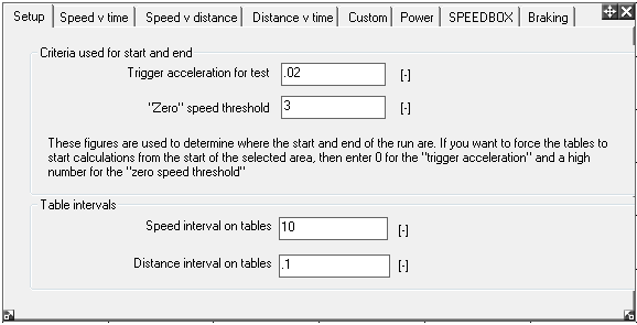 This has several applications. Obviously, it is ideal for simply extracting performance statistics for magazines etc, however, it is also very useful to check the efficiency of the brakes after a race, etc. There are very few options for the Performance Calculations: