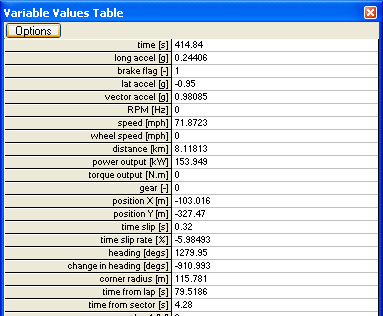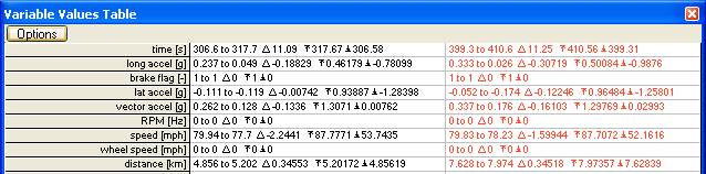You can also use the Values Table to display the variable data that is applicable to the ranges. When you select a range of data, i.e. a sector from the Lap And Sector Times table, or hold shift and drag a selection on the track map or XY graph, the values table will display up to three options: