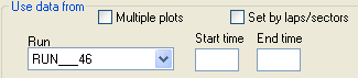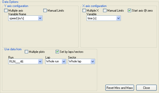 If you have more than one run loaded, you will be able to select it from the "Use data from" section. To choose the variable for the Y-Axis, select the variable you want to compare from the Variable Name list under the "Y axis configuration" section. To choose the variable from the X-Axis, choose the variable you wish to compare against from the Variable menu under "X axis configuration" section. To choose which part of the run you look at, make sure you have set up lap and track markers, then select which section you wish to look at from the drop down menus. Alternatively, if you've not got the lap and track markers set up, you can uncheck the "Set by laps/sectors" box and set which section of the entire run you look at by entering times into the boxes: